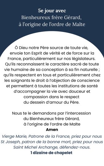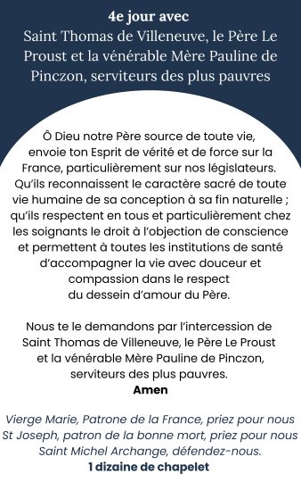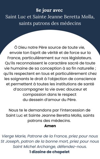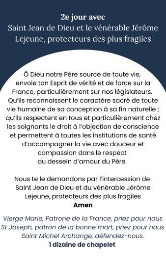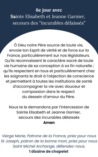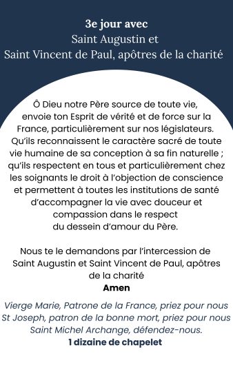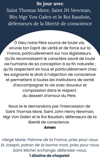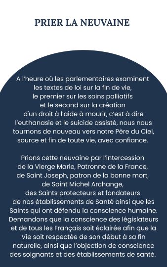 En communion avec toutes les Congrégations religieuses, une neuvaine est proposée pour le respect de la vie et de l’objection de conscience. Cette neuvaine a commencé le 16/02/2026, et se poursuivra jusqu’au 24/02/2026, période où le projet de loi est discuté à l’Assemblée.